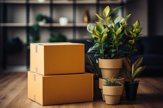 Cardboard boxes and house plants on wooden floor. Home relocation and interior decoration concept. Design for moving, storage, and real estate