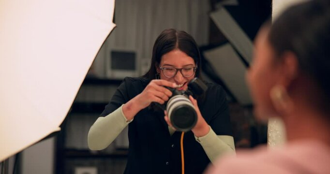 Happy woman, photographer and fun shoot with client for joyful or cheerful expression in studio. Friendly female person or producer talking to model for picture, photography or moment with camera