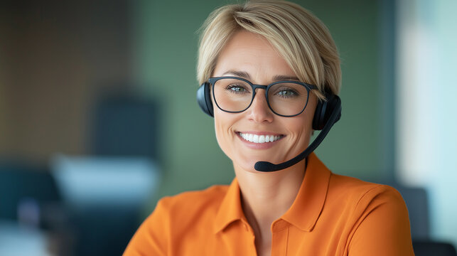 Smiling woman with headset embodying customer service excellence
