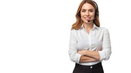 Smiling customer service representative wearing headset with transparent background