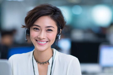 Professional female customer support agent smiling with headset