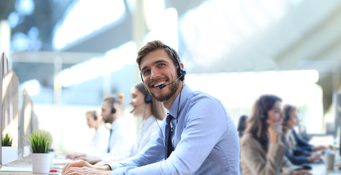 Portrait of call center worker accompanied by his team. Smiling customer support operator at work.