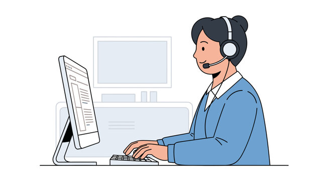 Customer service representative working at a computer with a headset, providing support and assistance