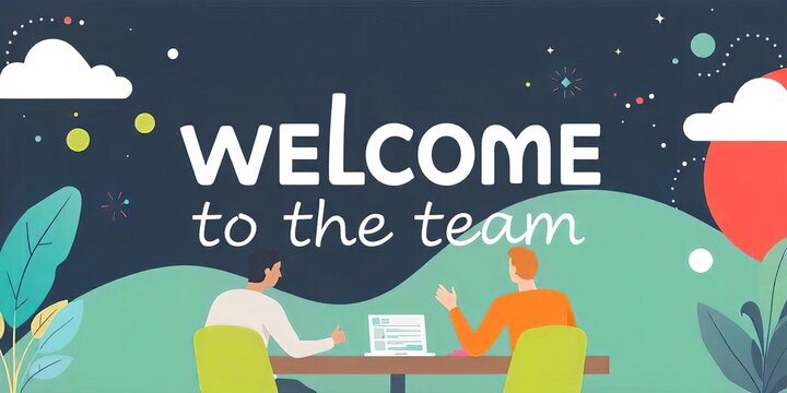A business team welcoming a new member to the team, their faces warm and welcoming. The new member is smiling and looking around the room, feeling excited and nervous at the same time.