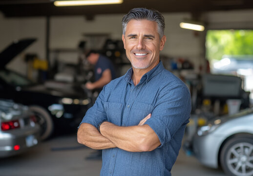 An attractive man stands with arms crossed, smiling in an auto repair shop filled with cars and busy mechanics around him