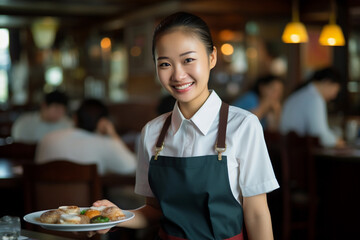 Smiley asian waitress serving food to customers in a restaurant, friendly professional looking staff.