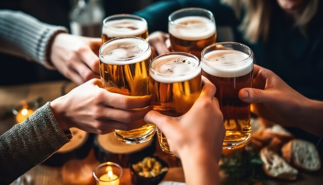 Happy friends drinking beer at brewery bar. Group of people cheering and drinking beer at bar pub table