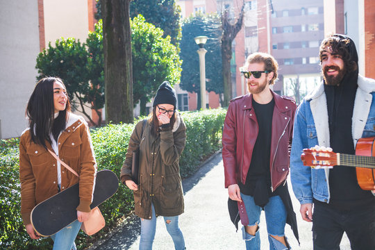 Group of young modern african black friends happily sitting together on the bench of the stairs in bright sunlight enjoying summer vacation