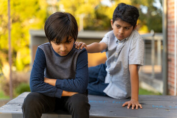 Friends caring concept. Resolving conflict with angry child. Two young boys together. Hand on shoulder. Kids communication concept.