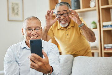 Group of diverse elderly friends sitting on a couch, laughing and enjoying each other's company in a cozy living room setting. Diverse old people talking and sitting on a sofa.