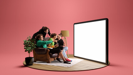 Happy young people, emotional friends watching football match, sport show or movie together. Youth sitting on sofa in front of huge 3D model of tv screen