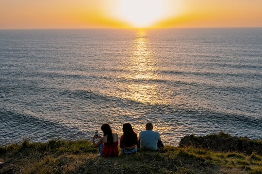 Smiling friends relaxing on sunny beach in vibrant july
