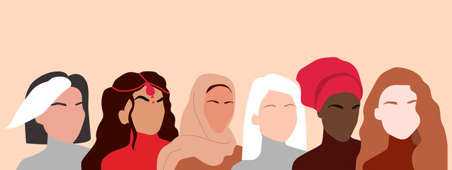Portrait of different nationalities and cultures woman. Girls standing together. Womens friendship, solidarity, sisterhood. Horizontal poster of the International Womens Day. Eps 10