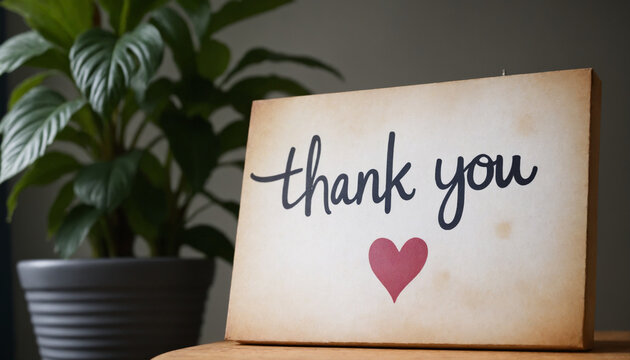 Handwritten "Thank You" card with heart symbol and potted plant for appreciation and kindness
