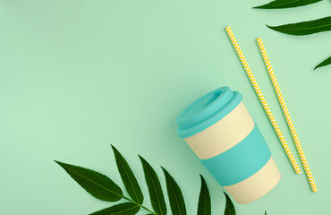 Bamboo eco cup with silicone holder and paper drinking straws on green background. Plastic free, eco friendy concept