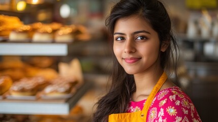 Cheerful young woman wearing apron in bakery surrounded by delicious pastries and sweets, showcasing warmth and flavor in a delightful dessert shop setting