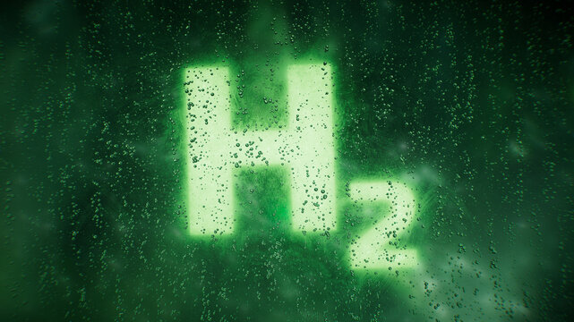 The "H2" symbolises hydrogen as a source of green energy, while the green colour and water droplets add to the impression of nature and purity. 3d rendering.