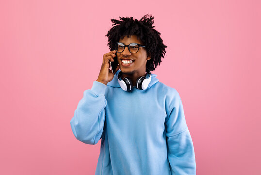 Happy black teenager with headphones talking on smartphone on pink studio background. Positive African American teen guy making phone call, smiling and having friendy conversation