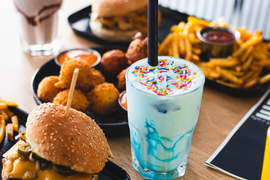 Whimsical Fast Food Icons Collection Featuring Burgers, Pizza, Fries, Sodas and Smoothie Cup Illustrations