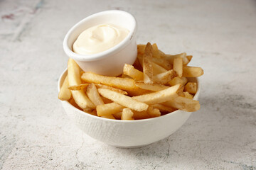 Generative AI illustration of delicious French fries served on wooden board with ketchup and mustard in wooden bowl garnished with salt