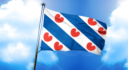 Friesland province of Netherlands flag waving on the top sunrise mist fog