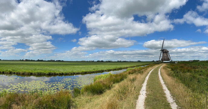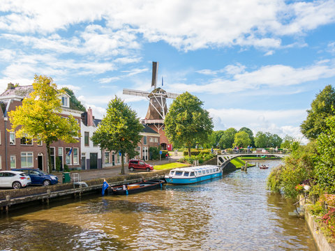 Windmill and bridge over canal in historic old town of Dokkum, Friesland, Netherlands