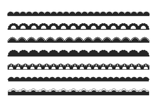 Scallop edge lace borders set. Black seamless patterns with dividers for frames or frill ribbons. Ornate lacework or trim decoration. Flat vector illustration collection isolated on white background