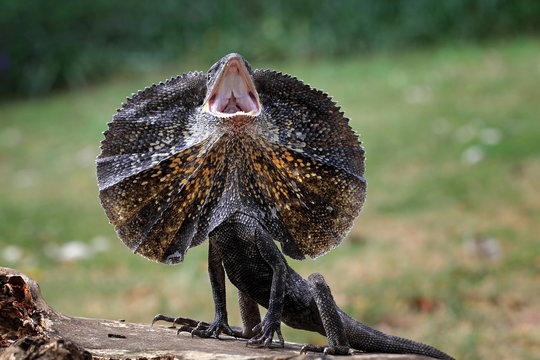A frilled lizard mid-run with its iconic neck flare reptiles displaying unique defensive behavior in the wild