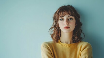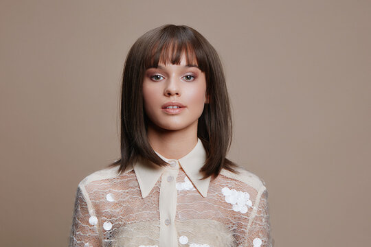 Portrait of woman with blunt bob haircut and bangs on solid background in studio lighting for beauty shot.