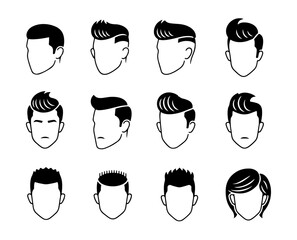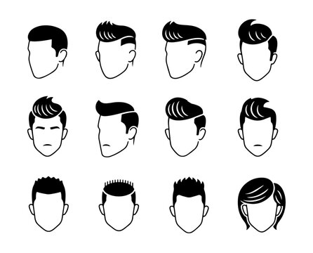 Twelve stylized male head outlines showcasing various modern and classic hairstyles in black and white.