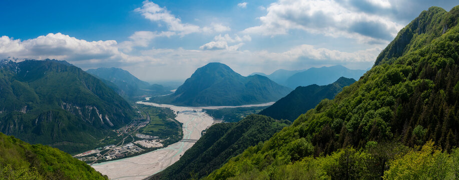View from Mount Forcella in Amaro (Carnia, Friuli Venezia Giulia). Landscape with mountains and river.