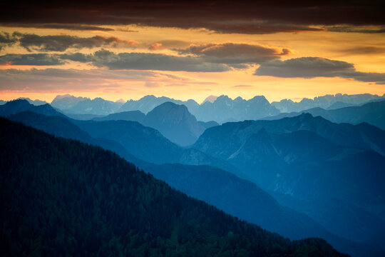 Europe, Italy, Friuli Venezia Giulia. Foggy Monte Lussari mountain at sunset.