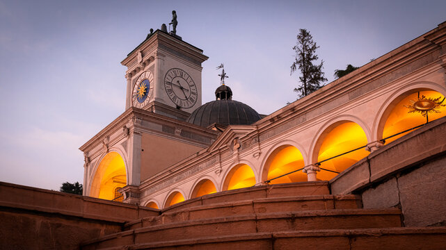 Beautiful classic Italian architecture at sunset. Magnificent clock tower, loggia, arches and colonnade in Udine city, Friuli Venezia Giulia region, Italy.