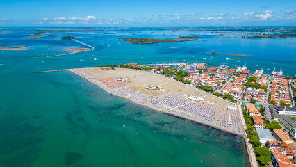 Aerial view of Grado, a picturesque seaside town in Friuli Venezia Giulia, Italy. The photo shows the historic old town with red-tiled roofs, charming harbor, long sandy beaches, blue water