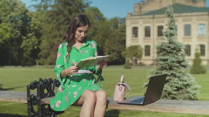 Close-up of frivolous woman sitting on bench in university park with laptop and notepad trying unsuccessfully to prepare for exam. Upset college student having difficulties with studying in sunny day.