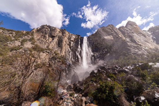 Directly below rotating footage of bright sunlight streaming through tall trees in forest