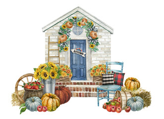 Autumn front door decor.Watercolor harvest decoration with sunflower bouquet, pumpkins,apples,lantern, wreath,hay.Fall decor composition for Thanksgiving and autumn arrangement card.Farmhouse garden