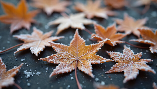 Macro photo of maple leaves covered with frost on a dark surface. Autumnal season is coming. Natural background template perfect for design.