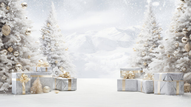 Snowy winter landscape with snow covered fir trees at sunrise.