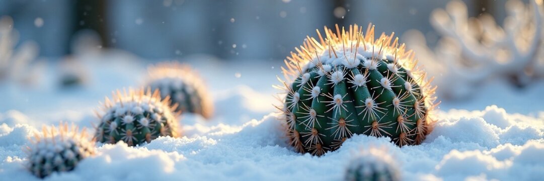 Frost resistant Cylindropuntia cactus in snowy winter environment, frost, nature, icy