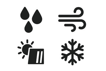 Solid glyph icon set showing weathering and natural effects. Vector symbols for rain, water resistance, wind erosion, sun UV degradation, and snow or frost damage.