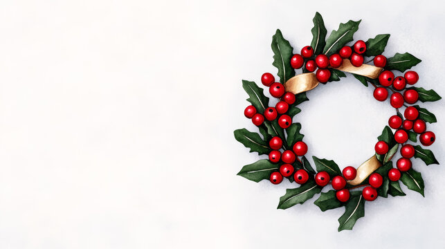 A charming holiday wreath adorned with red berries and gold ribbon on a frosted window watercolour illustration