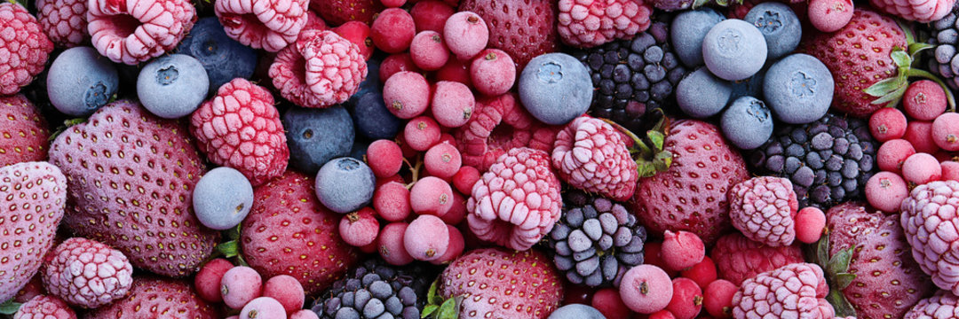 Mix of different frozen berries as background, banner design