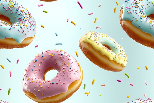 Assorted set colorful glazed donuts with mixed sprinkles and crumbs flying isolated on white background. Sweet pastry card. Fresh baked white, brown, pink, red doughnuts