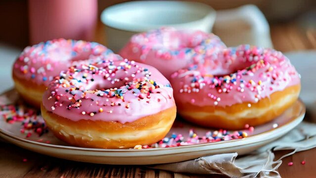Close-up of pink frosted donuts with colorful sprinkles on a plate.