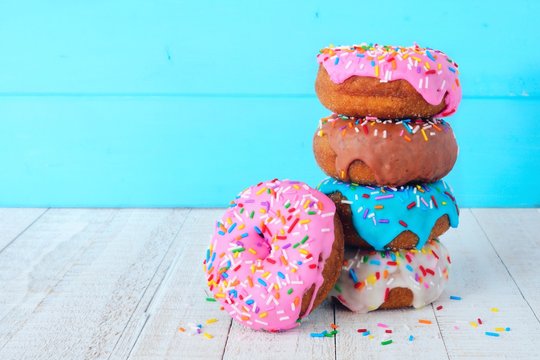 Assortment of eight colorful frosted donuts with sprinkles and icing  donut, doughnut