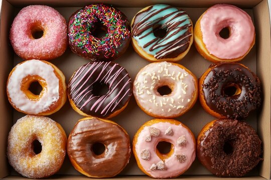 Assorted delicious donuts with colorful frosting and toppings in a box