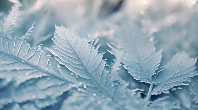 close-up of frost crystals on a plant with a blurred, snowy background. Frosted. Illustration