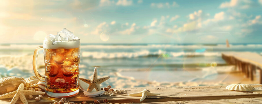 A retro summer beer banner with a frosty mug, vintage beach accessories, and a nostalgic boardwalk setting in the background.