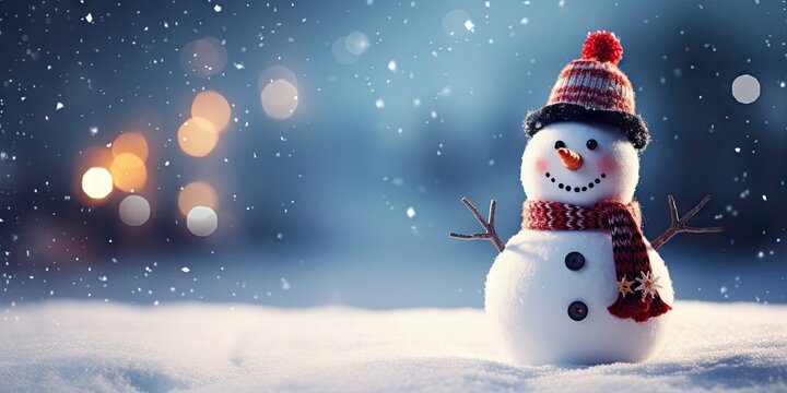 Snowman Standing Tall in a Blurry Snow Background, Eliciting the Whimsy and Charm of Winter's Delight
